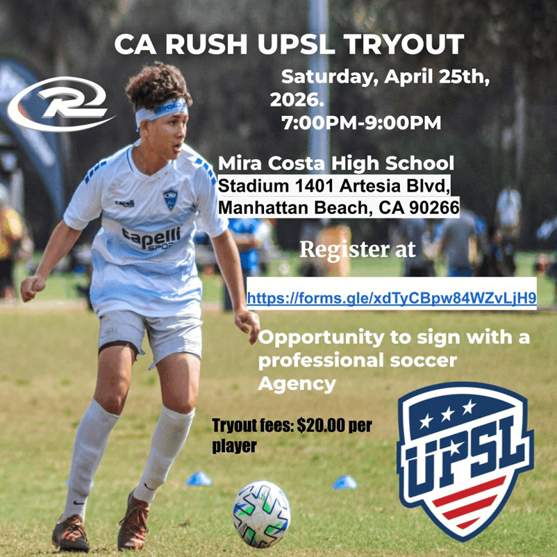 Open tryouts will be held for the California Rush competing in United Premier Soccer League (UPSL)